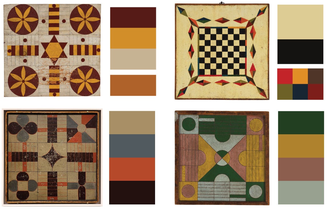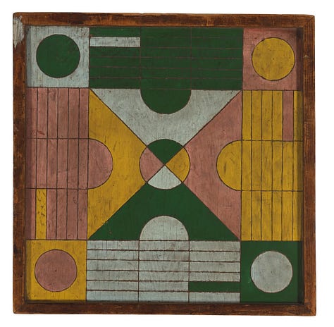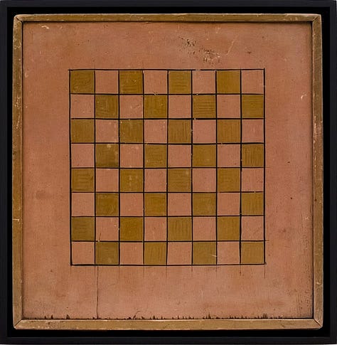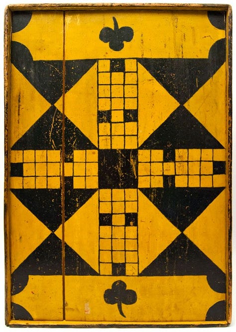Meanwhile, these old boards, painted in simple ways, feel complete just as they are. They weren’t meant to be art objects like mine were. Instead, they were made to invite people to gather and play together. I think they’re beautiful. Most were made by people whose names we’ll never know: farmers, cabinetmakers, parents, or anyone with some leftover paint and a free evening.