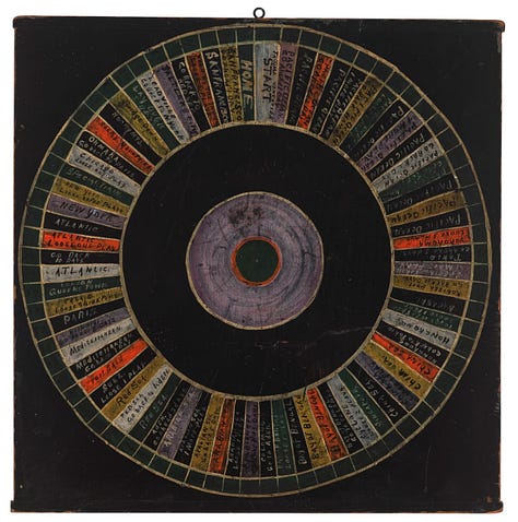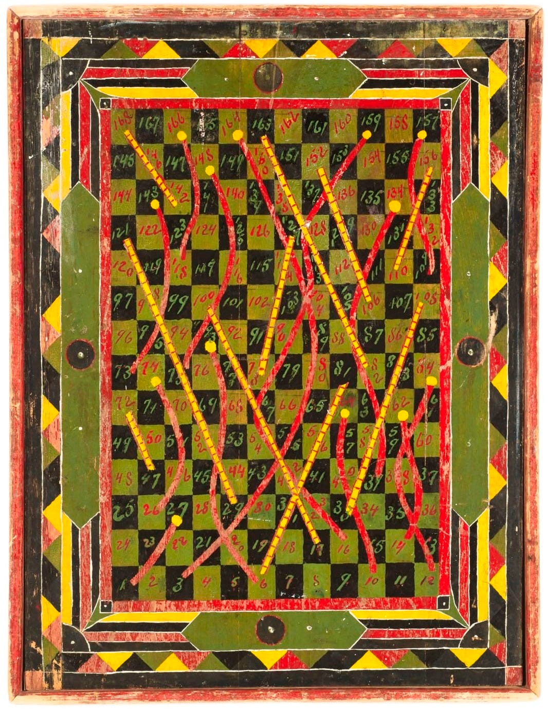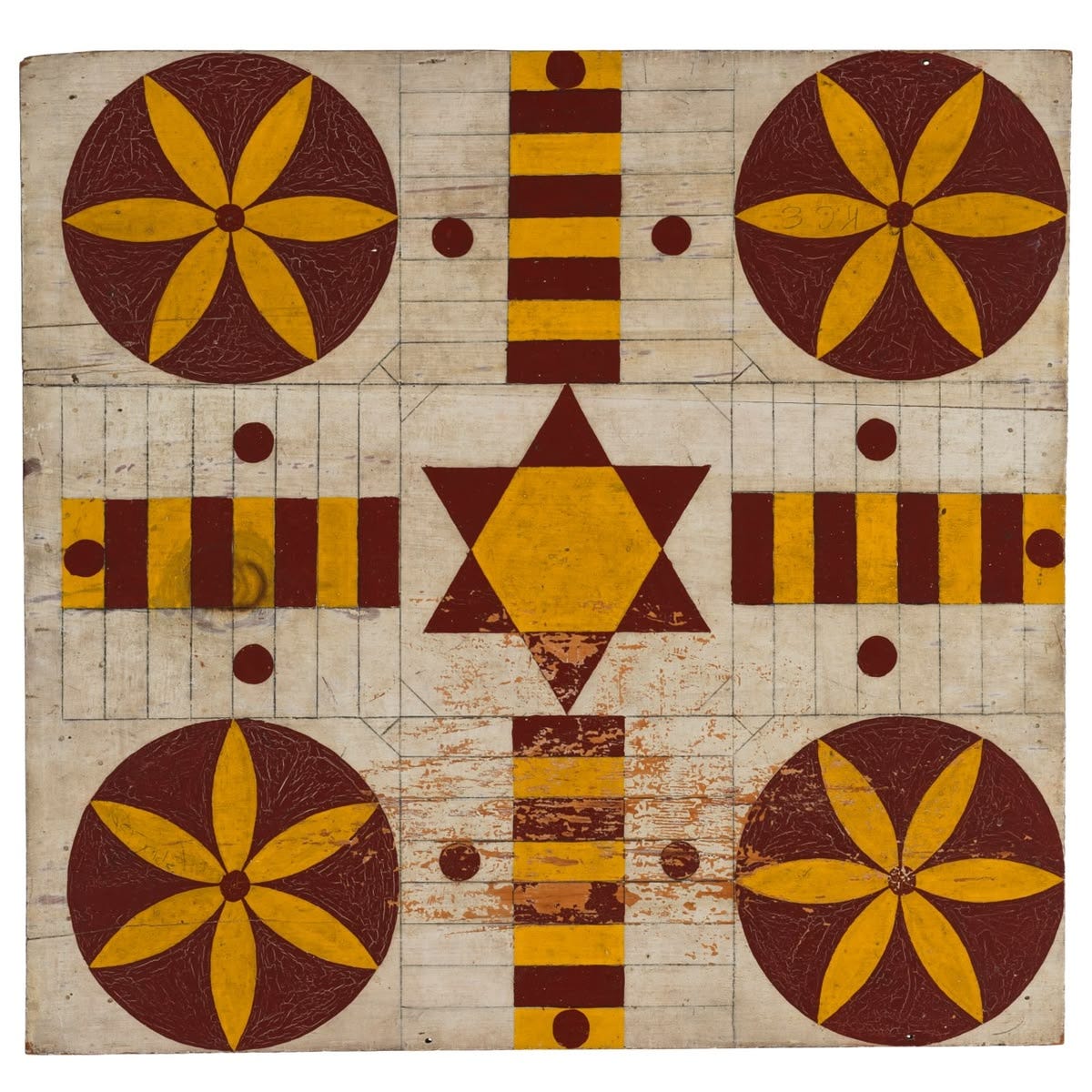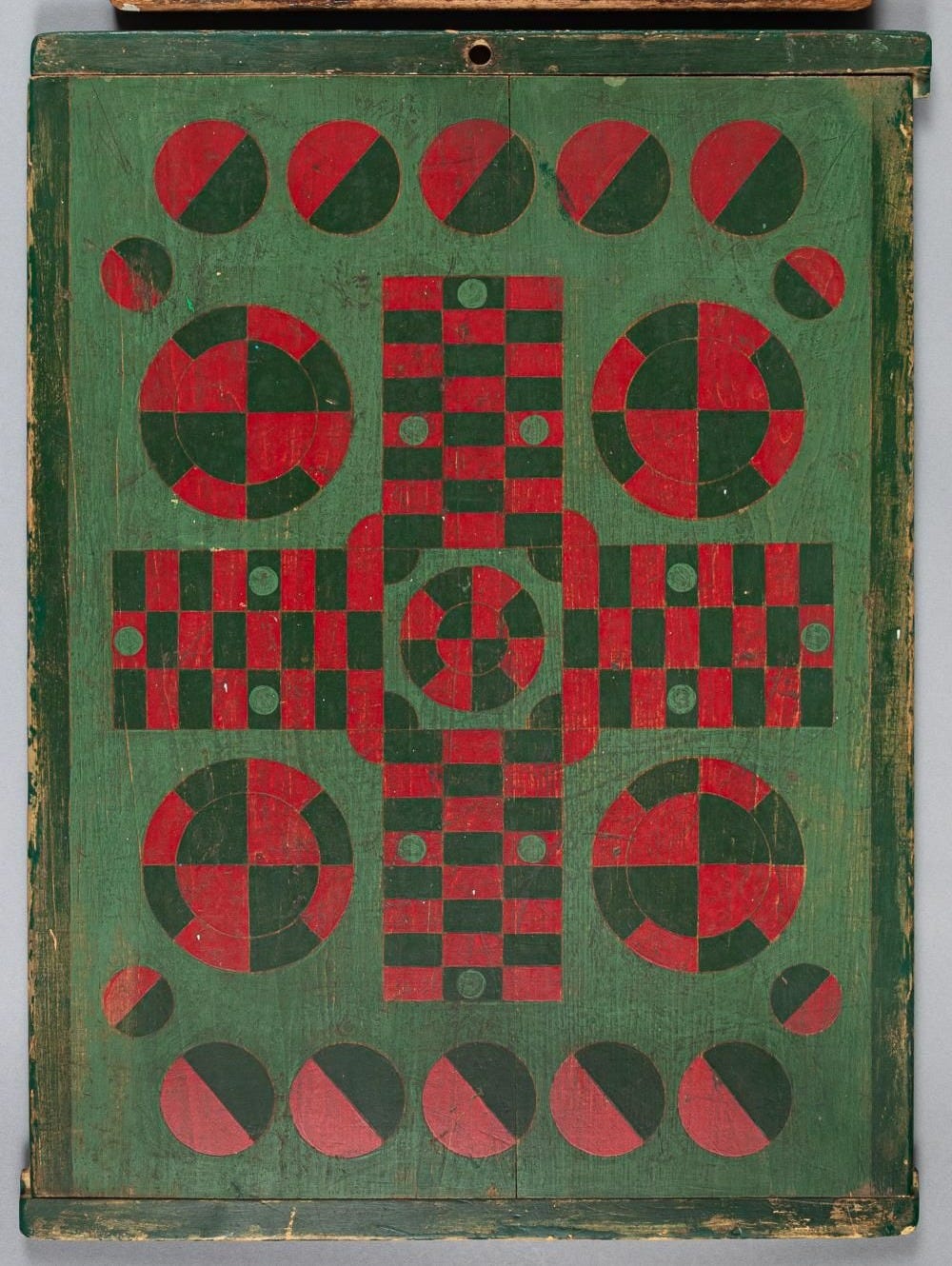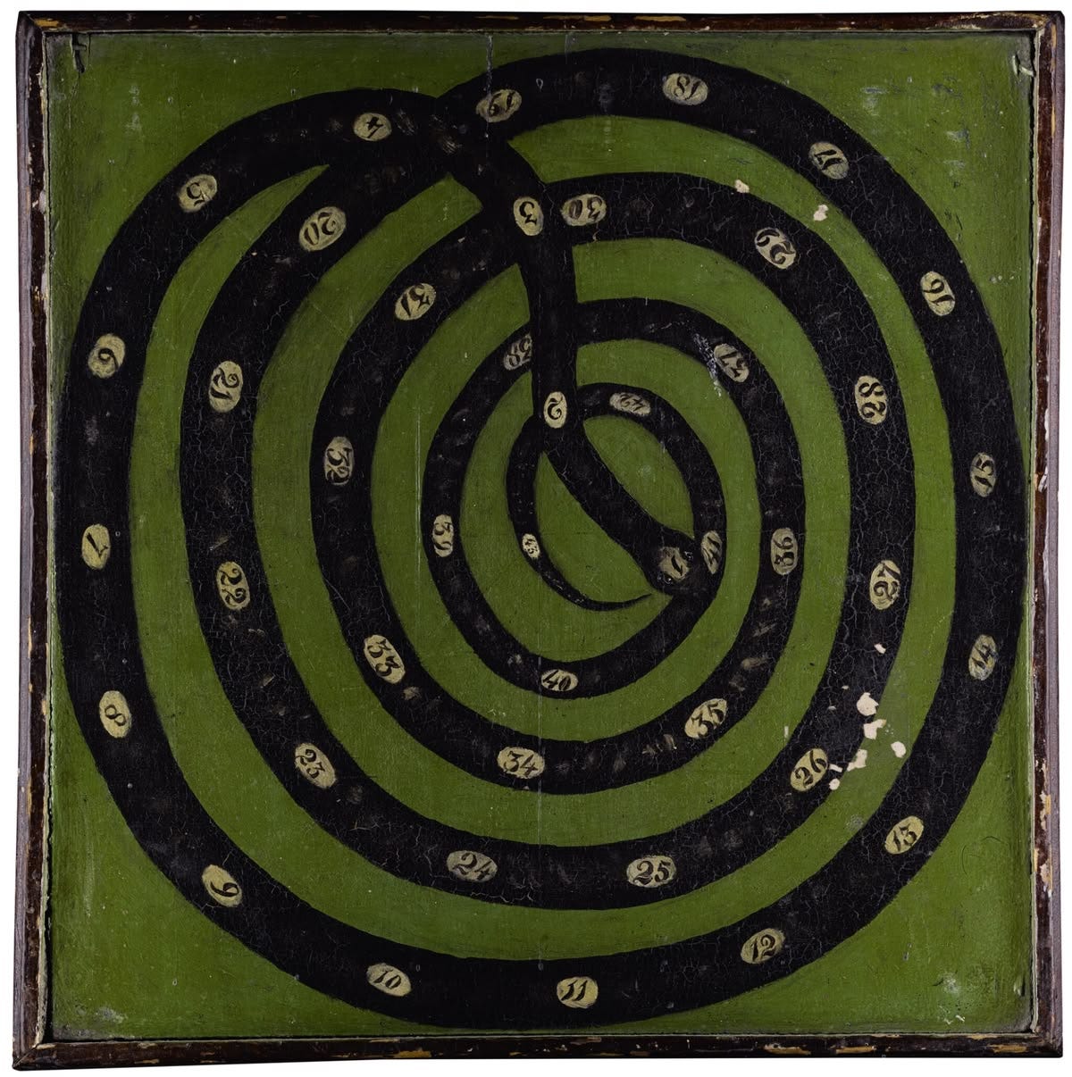 Hand-painted wooden game boards were everywhere from the 1830s to the 1930s, before mass-produced cardboard games took over. Families made their own fun, often with homemade boards or those crafted by local sign painters. Many were improvisational, using repurposed wood, household paint, and game pieces fashioned from whatever was at hand. When modern entertainment arrived, handmade boards faded away, only to be rediscovered much later as folk art.