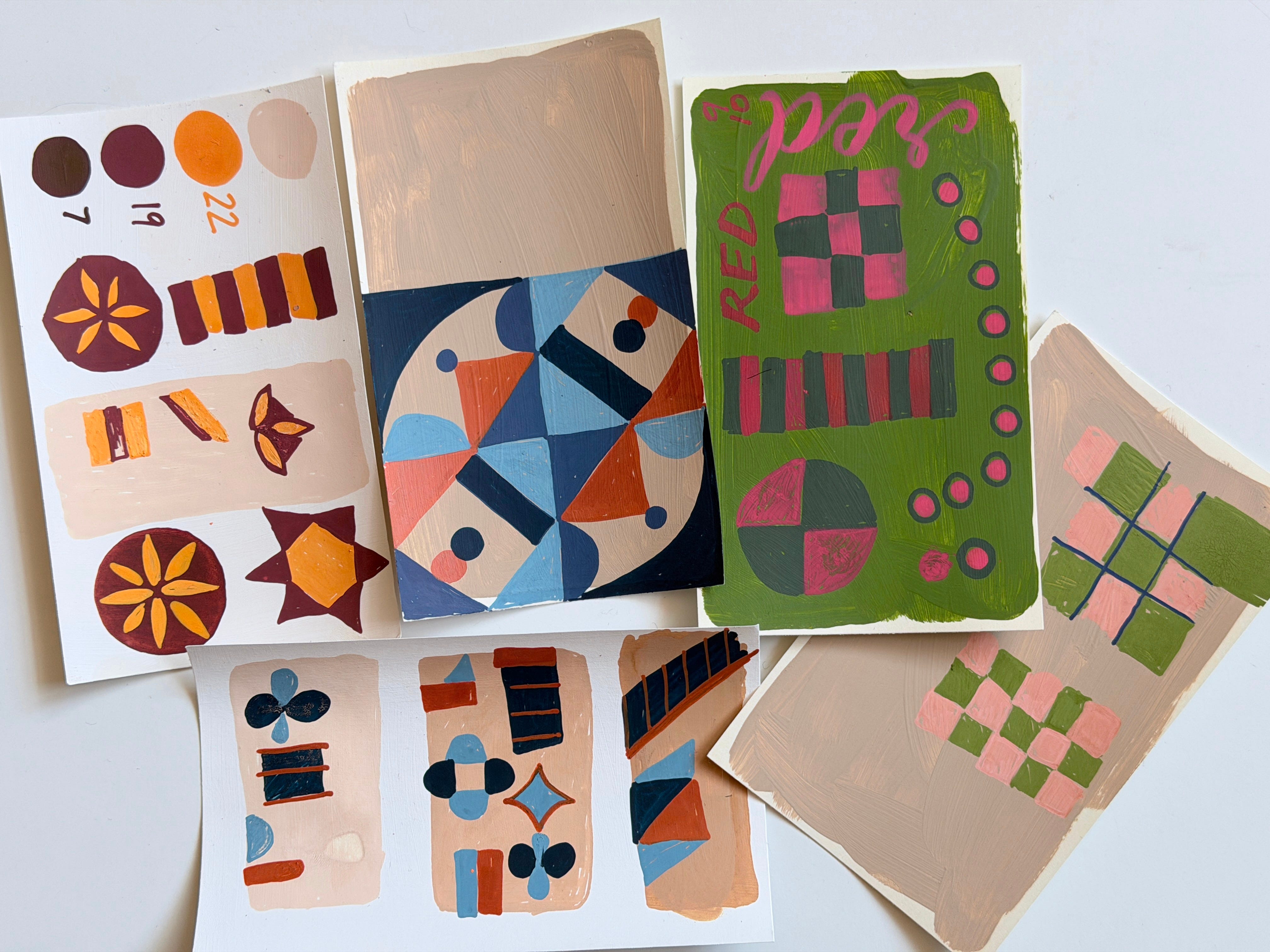 I’ve made a few of these studies digitally in Adobe, picking out palettes from four different boards. I’ve also created small swatch cards with paint and paint pens; quick, simple versions that aren’t meant to be precious. What interests me most is how useful these colors feel once they’re taken off the game board.
