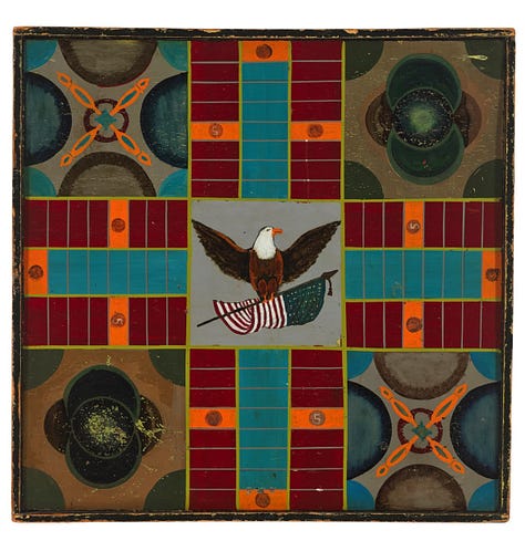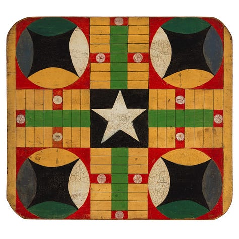 I’ve never played Parcheesi, and I don’t know the rules for half the boards I save. Still, I love the feeling they give me... the sense that something happened here, that people argued over plays, or that a child once dragged a piece too hard across the surface.